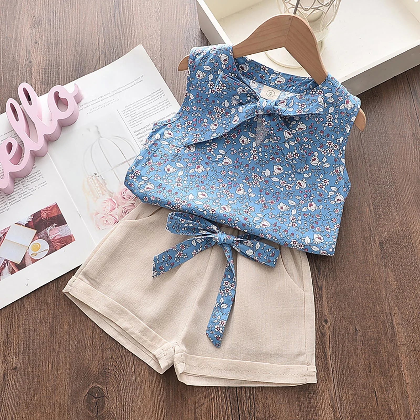 Toddler Girl Sleeveless Bow Tie Floral Pattern Top And Solid Color Pocketed Shorts With Belt Summer Girl's Outfits